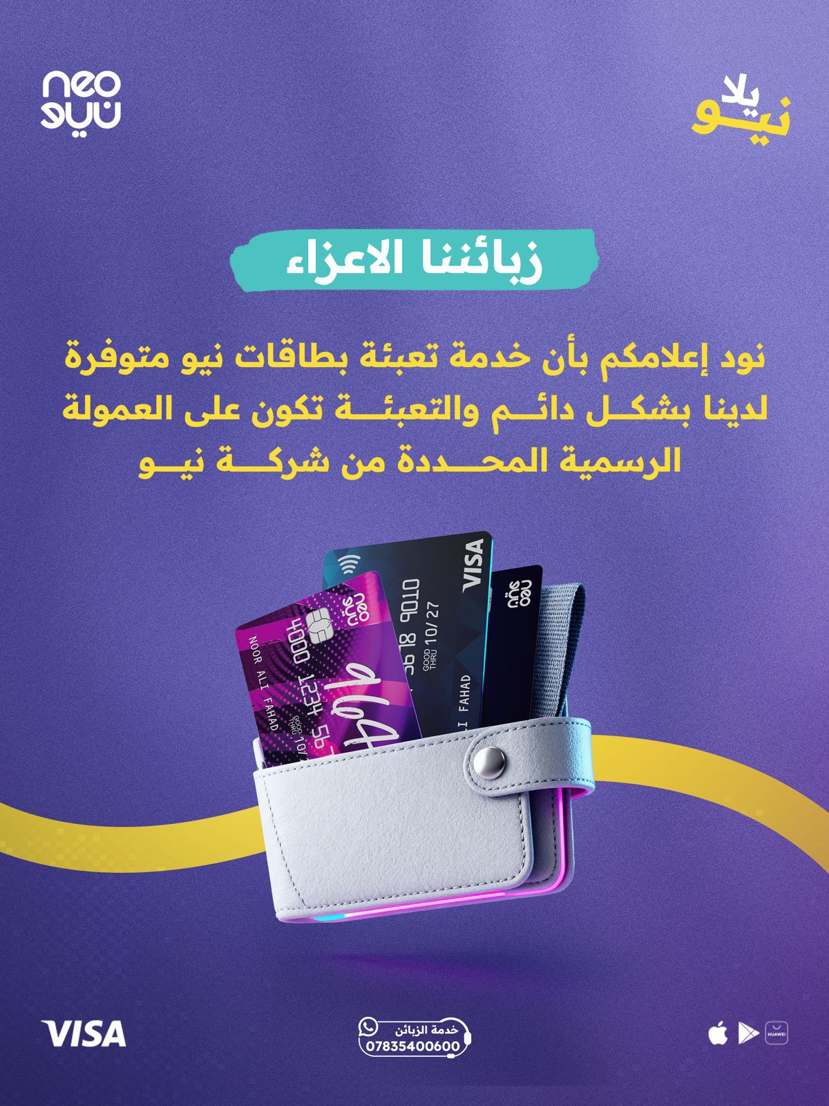 نود اعلامكم بأن خدمة تعبئة بطاقات نيو متوفرة بشكل دائم والتعبئة تكون على العمولة الرسمية المحددة من شركة نيو.